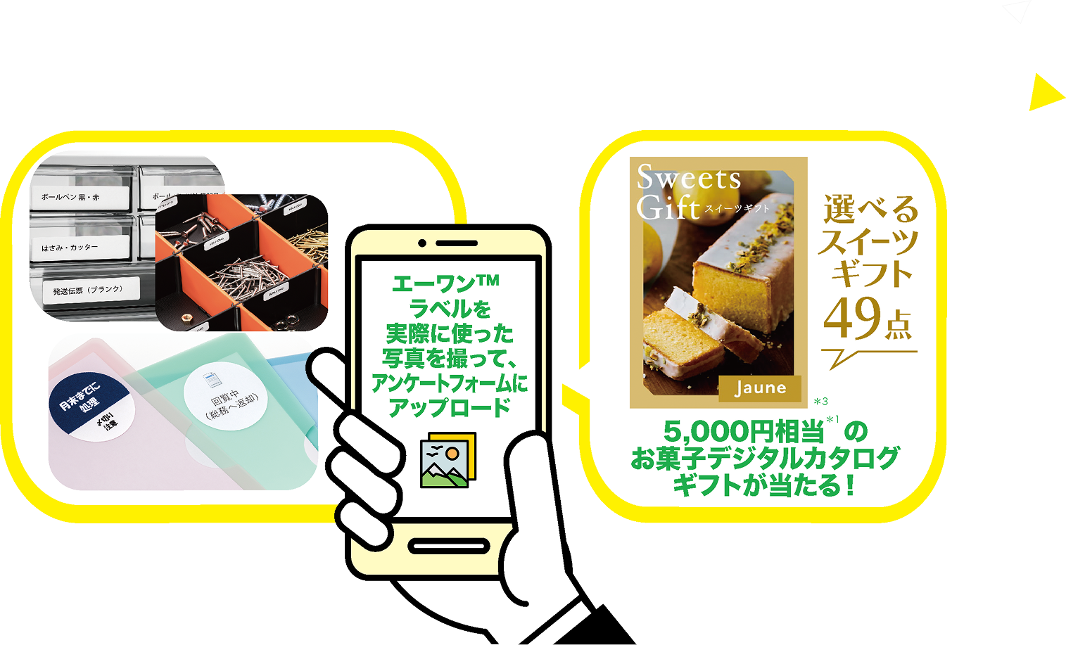 キャンペーン期間中に、エーワン™ ラベルを実際にお使いの写真を撮影の上、当キャンペーンのアンケートフォームにアップロードしていただいた方を対象としたプレゼントキャンペーンです。