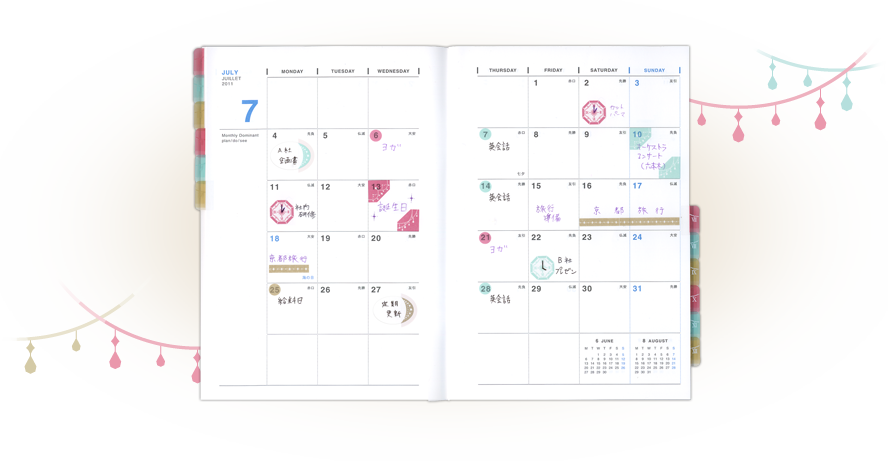 楽しみな一日は、フレームシールでかわいく飾り付けを。旅行で日付をまたぐ日は、オシャレなラインマークシールで。手帳を見るたびに気持ちがアップします。